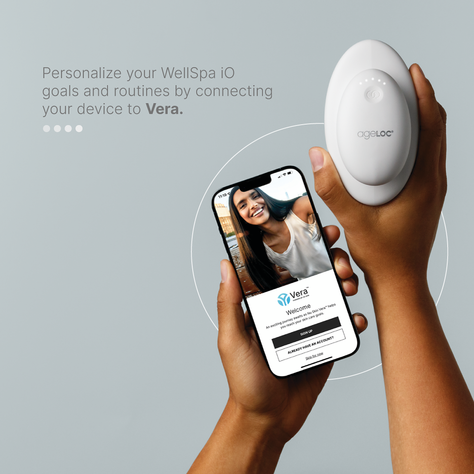 The NEW ageLOC WellSpa iO is a personalized wellness and beauty devices designed to restore, revitalize, and relax your body. It features Nu Skin exclusively designed metallic nodes as well as adaptive microcurrent technology that comfortably adjusts to your skin.