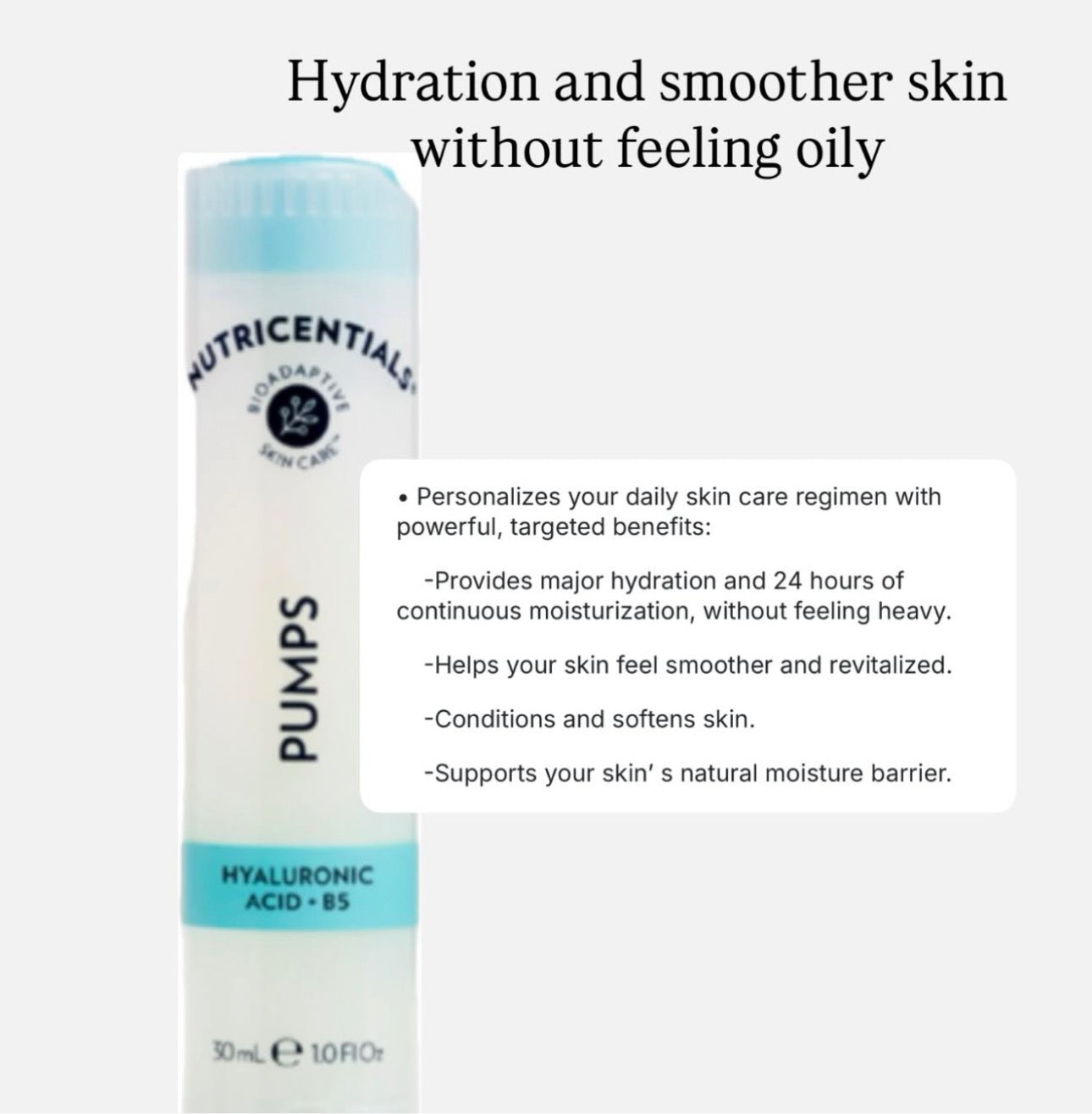 Nutricentials Pumps Hyaluronic Acid + B5 is a mega-moisturizing formula featuring our Bioadaptive Botanical Complex to help protect against, and increase resiliency to, everyday stressors like pollution and free radicals. Made with worry-free ingredients, this supercharged serum lets you personalize your daily regimen with ultimate hydration, for skin that feels silky smooth, sensuously soft, and visibly revitalized thanks to a specially formulated Pure Hyaluronic Acid Cocktail and Vitamin B5 (Panthenol).